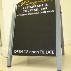 Our portfolio includes standard ‘A’ boards in aluminium , swinging signs, large forecourt boards, pavement signs with waterproof casing, chalk boards, plus a range that includes ‘clip frames’ to allow poster inserts to be changed in a matter of seconds. And because you’ll want to use your ad. boards or pavement boards in every type of weather, they can be weighted to withstand the worst that nature can throw at them.
